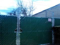 Malla ciclónica a dos metros de altura con tres hilos de púa en la parte superior, así como un portón de cinco metros con cubierta de cinta plástica en color verde.