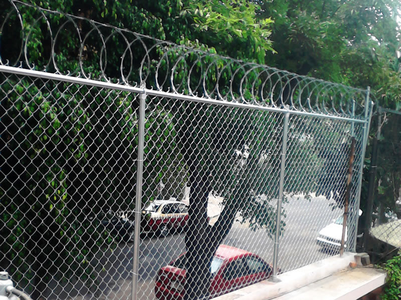 Malla ciclónica a dos metros de altura con cocerpúa en la parte superior de 45 cm de diámetro, así como un hilo de alambre de púas. El trabajo se eleva a dos metros del nivel del piso sobre una marquesina.