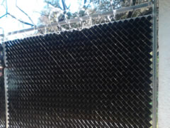 Malla ciclónica a dos metros y medio de altura cubierta con cinta plástica en color negro y concerpúa en la parte superior de 45 cm de diámetro; así como una puerta corrediza con riel en la parte superior.
